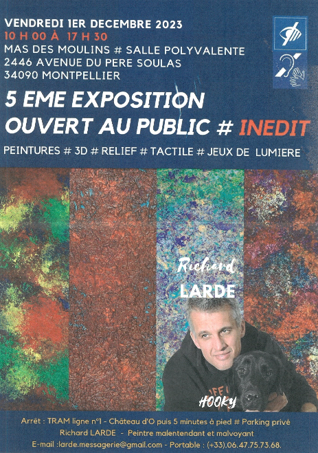En effet, Richard LARDE, bénéficiaire du secteur de Montpellier, réalise des peintures, qui mêlent différents matériaux, et sont adaptées aux malvoyants et non-voyants puisque ses oeuvres sont des tableaux “tactiles” .